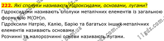 Які сполуки називають гідроксидами, основами, лугами? Гідроксидами називають сполуки металічних елементів із загальною формулою М(ОН)n. Гідроксили Натрію, Калію, Барію та багатьох інших металічних елементів називають основами. Розчинні та малорозчинні основи називають лугами.