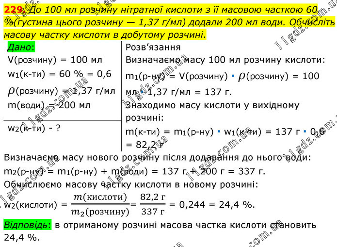 До 100 мл розчину нітратної кислоти з її масовою часткою 60 %(густина цього розчину — 1,37 г/мл) додали 200 мл води. Обчисліть масову частку кислоти в добутому розчині. Розв’язання Визначаємо масу 100 мл розчину кислоти: m1(р-ну) = V(розчину) ∙ ρ(розчину) = 100 мл ∙ 1,37 г/мл = 137 г. Знаходимо масу кислоти у вихідному розчині: m(к-ти) = m1(р-ну) ∙ w1(к-ти) = 137 г ∙ 0,6 = 82,2 г Визначаємо масу нового розчину після додавання до нього води: m2(р-ну) = m1(р-ну) + m(води) = 137 г + 200 г = 337 г. Обчислюємо масову частку кислоти в новому розчині: w2(кислоти) = (m(кислоти))/(m_2 (розчину))= (82,2 г)/(337 г) = 0,244 = 24,4 %. Відповідь: в отриманому розчині масова частка кислоти становить 24,4 %.