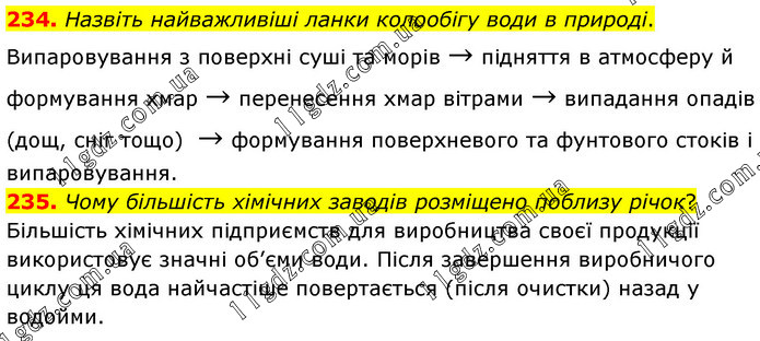 Назвіть найважливіші ланки колообігу води в природі. Випаровування з поверхні суші та морів → підняття в атмосферу й формування хмар → перенесення хмар вітрами → випадання опадів (дощ, сніг тощо) → формування поверхневого та фунтового стоків і випаровування. 235. Чому більшість хімічних заводів розміщено поблизу річок? Більшість хімічних підприємств для виробництва своєї продукції використовує значні об’єми води. Після завершення виробничого циклу ця вода найчастіше повертається (після очистки) назад у водойми.