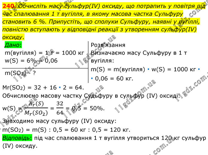 Обчисліть масу сульфур(IV) оксиду, що потрапить у повітря під час спалювання 1 т вугілля, в якому масова частка Сульфуру становить 6 %. Припустіть, що сполуки Сульфуру, наявні у вугіллі, повністю вступають у відповідні реакції з утворенням сульфур(IV) оксиду. Розв‘язання Визначаємо масу Сульфуру в 1 т вугілля: m(S) = m(вугілля) ∙ w(S) = 1000 кг ∙ 0,06 = 60 кг. Mr(SO2) = 32 + 16 ∙ 2 = 64. Обчислюємо масову частку Судьфуру в сульфур (IV) оксиді: w(S) = (A_r (S))/(M_r (SO_2)) = 32/64 = 0,5 = 50%. Знаходимо масу сульфуру (IV) оксиду: m(SO2) = m(S) : 0,5 = 60 кг : 0,5 = 120 кг. Відповідь: під час спалювання 1 т вугілля утвориться 120 кг сульфур (IV) оксиду.