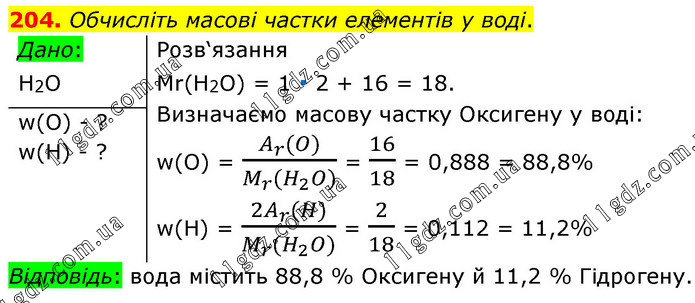 Обчисліть масові частки елементів у воді. Розв‘язання Mr(H2O) = 1 ∙ 2 + 16 = 18. Визначаємо масову частку Оксигену у воді: w(O) = (A_r (O))/(M_r (H_2 O)) = 16/18 = 0,888 = 88,8% w(H) = (〖2A〗_r (H))/(M_r (H_2 O)) = 2/18 = 0,112 = 11,2% Відповідь: вода містить 88,8 % Оксигену й 11,2 % Гідрогену.