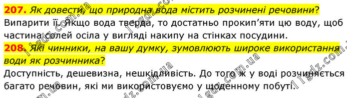 Як довести, що природна вода містить розчинені речовини? Випарити її. Якщо вода тверда, то достатньо прокип’яти цю воду, щоб частина солей осіла у вигляді накипу на стінках посудини. 208. Які чинники, на вашу думку, зумовлюють широке використання води як розчинника? Доступність, дешевизна, нешкідливість. До того ж у воді розчиняється багато речовин, які ми використовуємо у щоденному побуті.