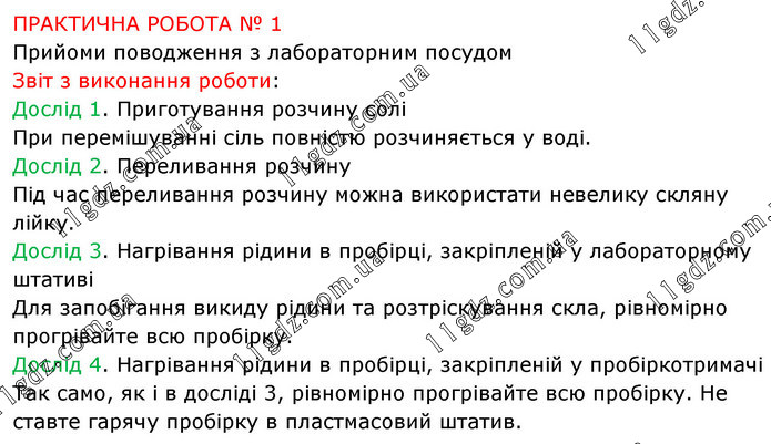 ПРАКТИЧНА РОБОТА № 1 Прийоми поводження з лабораторним посудом Звіт з виконання роботи: Дослід 1. Приготування розчину солі При перемішуванні сіль повністю розчиняється у воді. Дослід 2. Переливання розчину Під час переливання розчину можна використати невелику скляну лійку. Дослід 3. Нагрівання рідини в пробірці, закріпленій у лабораторному штативі Для запобігання викиду рідини та розтріскування скла, рівномірно прогрівайте всю пробірку. Дослід 4. Нагрівання рідини в пробірці, закріпленій у пробіркотримачі Так само, як і в досліді 3, рівномірно прогрівайте всю пробірку. Не ставте гарячу пробірку в пластмасовий штатив.