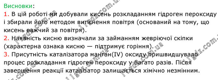 Висновки: 1. В цій роботі ми добували кисень розкладанням гідроген пероксиду і збирали його методом витіснення повітря (оснований на тому, що кисень важчий за повітря). 2. Наявність кисню визначали за займанням жевріючої скіпки (характерна ознака кисню — підтримує горіння). 3. Присутність каталізатора манган(ІV) оксиду пришвидшувало процес розкладання гідроген пероксиду у багато разів. Після завершення реакції каталізатор залишається хімічно незмінним.