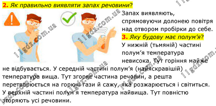 Як правильно виявляти запах речовини? Запах виявляють, спрямовуючи долонею повітря над отвором пробірки до себе. 3. Яку будову має полум’я? У нижній (тьмяній) частині полум’я температура невисока. Тут горіння майже не відбувається. У середній частині полум’я (найяскравішій) температура вища. Тут згоряє частина речовин, а решта перетворюється на горючі гази й сажу, яка розжарюється і світиться. У верхній частині полум’я температура найвища. Тут повністю згоряють усі речовини.
