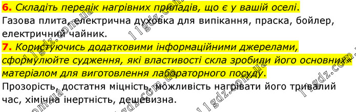 Складіть перелік нагрівних приладів, що є у вашій оселі. Газова плита, електрична духовка для випікання, праска, бойлер, електричний чайник. 7. Користуючись додатковими інформаційними джерелами, сформулюйте судження, які властивості скла зробили його основних« матеріалом для виготовлення лабораторного посуду. Прозорість, достатня міцність, можливість нагрівати його тривалий час, хімічна інертність, дешевизна.