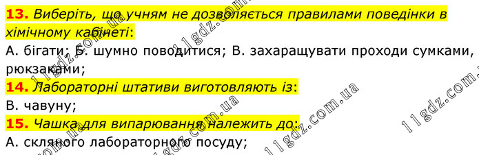 Виберіть, що учням не дозволяється правилами поведінки в хімічному кабінеті: А. бігати; Б. шумно поводитися; В. захаращувати проходи сумками, рюкзаками; 14. Лабораторні штативи виготовляють із: В. чавуну; 15. Чашка для випарювання належить до: А. скляного лабораторного посуду;