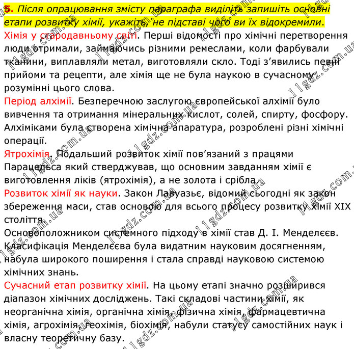 Після опрацювання змісту параграфа виділіть запишіть основні етапи розвитку хімії, укажіть, не підставі чого ви їх відокремили. Хімія у стародавньому світі. Перші відомості про хімічні перетворення люди отримали, займаючись різними ремеслами, коли фарбували тканини, виплавляли метал, виготовляли скло. Тоді з’явились певні прийоми та рецепти, але хімія ще не була наукою в сучасному розумінні цього слова. Період алхімії. Безперечною заслугою європейської алхімії було вивчення та отримання мінеральних кислот, солей, спирту, фосфору. Алхіміками була створена хімічна апаратура, розроблені різні хімічні операції. Ятрохімія. Подальший розвиток хімії пов’язаний з працями Парацельса який стверджував, що основним завданням хімії є виготовлення ліків (ятрохімія), а не золота і срібла. Розвиток хімії як науки. Закон Лавуазьє, відомий сьогодні як закон збереження маси, став основою для всього процесу розвитку хімії XIX століття. Основоположником системного підходу в хімії став Д. І. Менделєєв. Класифікація Менделєєва була видатним науковим досягненням, набула широкого поширення і стала справді науковою системою хімічних знань. Сучасний етап розвитку хімії. На цьому етапі значно розширився діапазон хімічних досліджень. Такі складові частини хімії, як неорганічна хімія, органічна хімія, фізична хімія, фармацевтична хімія, агрохімія, геохімія, біохімія, набули статусу самостійних наук і власну теоретичну базу.