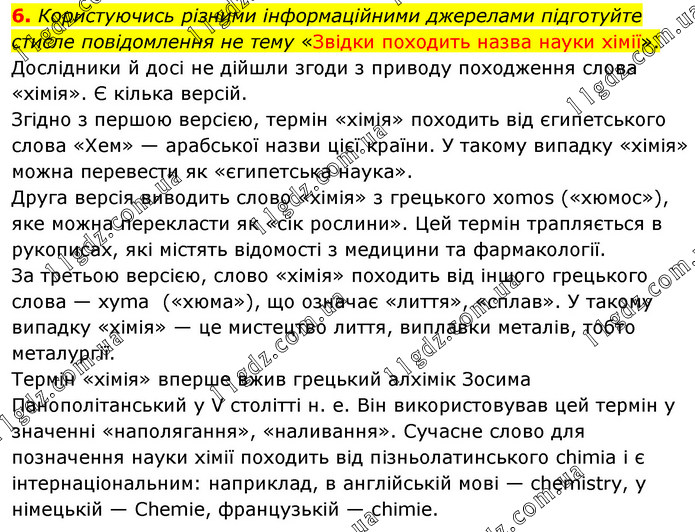 Користуючись різними інформаційними джерелами підготуйте стисле повідомлення не тему «Звідки походить назва науки хімії». Дослідники й досі не дійшли згоди з приводу походження слова «хімія». Є кілька версій. Згідно з першою версією, термін «хімія» походить від єгипетського слова «Хем» — арабської назви цієї країни. У такому випадку «хімія» можна перевести як «єгипетська наука». Друга версія виводить слово «хімія» з грецького xomos («хюмос»), яке можна перекласти як «сік рослини». Цей термін трапляється в рукописах, які містять відомості з медицини та фармакології. За третьою версією, слово «хімія» походить від іншого грецького слова — xyma («хюма»), що означає «лиття», «сплав». У такому випадку «хімія» — це мистецтво лиття, виплавки металів, тобто металургії. Термін «хімія» вперше вжив грецький алхімік Зосима Панополітанський у V столітті н. е. Він використовував цей термін у значенні «наполягання», «наливання». Сучасне слово для позначення науки хімії походить від пізньолатинського chimia і є інтернаціональним: наприклад, в англійській мові — chemistry, у німецькій — Chemie, французькій — chimie.