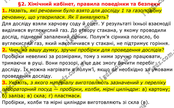 §2. Хімічний кабінет, правила поведінки та безпеки 1. Назвіть, які речовини було взято для досліду 1 та газоподібну речовину, що утворилася. Як її виявляють? Для досліду взяли харчову соду й оцет. У результаті їхньої взаємодії виділився вуглекислий газ. До отвору стакана, у якому проводили дослід, піднесли запалений сірник. Полум’я сірника погасло, бо вуглекислий газ, який накопичився у стакані, не підтримує горіння. 2. Чим, на вашу думку, зручні пробірки для проведення дослідів? Пробірки невеликі за розмірами, тому з ними зручно працювати, тримаючи в руці. Вони прозорі, а це дає змогу бачити перебіг досліду. Їх можна нагрівати в полум’ї, якщо це необхідно за умовами проведення досліду. 3. Укажіть, з якого матеріалу виготовляють зазначений у переліку лабораторний посуд — пробірки, колби, мірні циліндри: а) картону; б) заліза; в) скла; г) пластмаси. Пробірки, колби та мірні циліндри виготовляють зі скла (в).