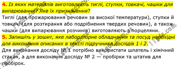 Із яких матеріалів виготовляють тиглі, ступки, товкачі, чашки для випарювання? Яке їх призначення? Тиглі (для прожарювання речовин за високої температури), ступки й товкачі (для розтирання або подрібнення твердих речовин), а також чашки (для випарювання розчинів) виготовляють з порцеляни. 5. Запишіть у зошит, яке лабораторне обладнання та посуд необхідні для виконання описаних в тексті підручника дослідів 1 і 2. Для виконання досліду № 1 потрібно використати шпатель і хімічний стакан, а для виконання досліду № 2 — пробірки та штатив для пробірок.
