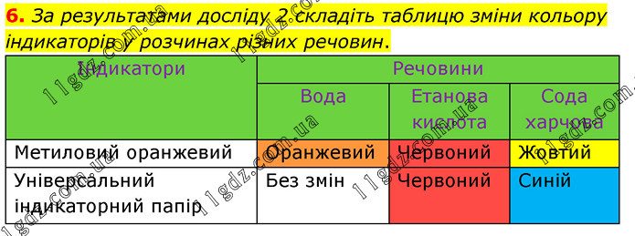 За результатами досліду 2 складіть таблицю зміни кольору індикаторів у розчинах різних речовин.