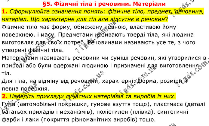 §5. Фізичні тіла і речовини. Матеріали 1. Сформулюйте означення понять: фізичне тіло, предмет, речовина, матеріал. Що характерне для тіл але відсутнє в речовин? Фізичне тіло має форму, обмежену певною, властивою йому поверхнею, і масу. Предметами називають тверді тіла, які людина виготовляє для своїх потреб. Речовинами називають усе те, з чого утворені фізичні тіла. Матеріалами називають речовини чи суміші речовин, які утворилися в природі або були одержані людиною і призначені для виготовлення тіл. Для тіла, на відміну від речовини, характерні: форма, розміри й певна поверхня. 2. Наведіть приклади сучасних матеріалів та виробів із них. Гума (автомобільні покришки, гумове взуття тощо), пластмаса (деталі багатьох приладів і механізмів), поліетилен (плівка), синтетичні фарби і лаки (покриття різноманітних виробів) тощо.