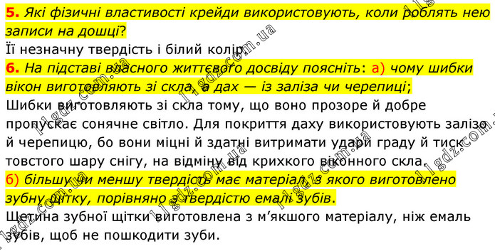 Які фізичні властивості крейди використовують, коли роблять нею записи на дошці? Її незначну твердість і білий колір. 6. На підставі власного життєвого досвіду поясніть: а) чому шибки вікон виготовляють зі скла, а дах — із заліза чи черепиці; Шибки виготовляють зі скла тому, що воно прозоре й добре пропускає сонячне світло. Для покриття даху використовують залізо й черепицю, бо вони міцні й здатні витримати удари граду й тиск товстого шару снігу, на відміну від крихкого віконного скла. б) більшу чи меншу твердість має матеріал, з якого виготовлено зубну щітку, порівняно з твердістю емалі зубів. Щетина зубної щітки виготовлена з м’якшого матеріалу, ніж емаль зубів, щоб не пошкодити зуби.
