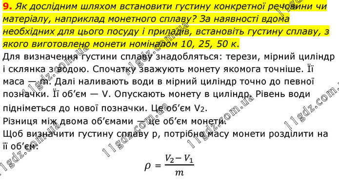 Як дослідним шляхом встановити густину конкретної речовини чи матеріалу, наприклад монетного сплаву? За наявності вдома необхідних для цього посуду і приладів, встановіть густину сплаву, з якого виготовлено монети номіналом 10, 25, 50 к. Для визначення густини сплаву знадобляться: терези, мірний циліндр і склянка з водою. Спочатку зважують монету якомога точніше. Її маса — m. Далі наливають води в мірний циліндр точно до певної позначки. Її об’єм — V. Опускають монету в циліндр. Рівень води підніметься до нової позначки. Це об’єм V2. Різниця між двома об’ємами — це об’єм монети. Щоб визначити густину сплаву р, потрібно масу монети розділити на її об’єм: ρ = (V_2- V_1)/m