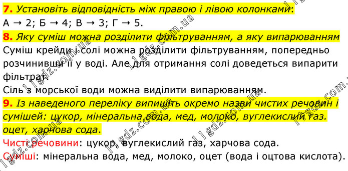 Установіть відповідність між правою і лівою колонками: А ➝ 2; Б ➝ 4; В ➝ 3; Г ➝ 5. 8. Яку суміш можна розділити фільтруванням, а яку випарюванням Суміш крейди і солі можна розділити фільтруванням, попередньо розчинивши її у воді. Але для отримання солі доведеться випарити фільтрат. Сіль з морської води можна виділити випарюванням. 9. Із наведеного переліку випишіть окремо назви чистих речовин і сумішей: цукор, мінеральна вода, мед, молоко, вуглекислий газ. оцет, харчова сода. Чисті речовини: цукор, вуглекислий газ, харчова сода. Суміші: мінеральна вода, мед, молоко, оцет (вода і оцтова кислота).