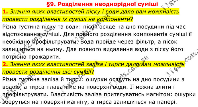 §9. Розділення неоднорідної суміші 1. Знання яких властивостей піску і води дало вам можливість провести розділення їх суміші на компоненти? Різна густина піску та води: пісок осяде на дно посудини під час відстоювання суміші. Для повного розділення компонентів суміші її необхідно профільтрувати. Вода пройде через фільтр, а пісок залишиться на ньому. Для повного видалення води з піску його потрібно прожарити. 2. Знання яких властивостей заліза і тирси дало вам можливість провести розділення цієї суміші? Різна густина заліза й тирси: ошурки осядуть на дно посудини з водою, а тирса плаватиме на поверхні води. Її можна злити і профільтрувати. Властивість заліза притягуватись магнітом: ошурки зберуться на поверхні магніту, а тирса залишиться на папері.