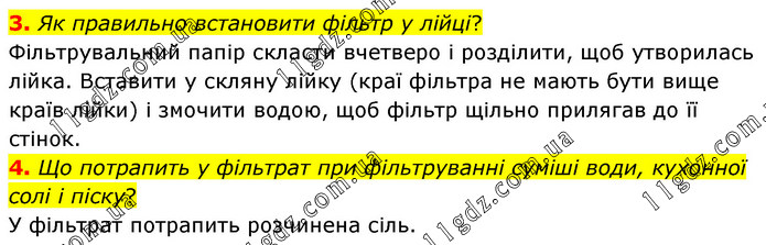 Як правильно встановити фільтр у лійці? Фільтрувальний папір скласти вчетверо і розділити, щоб утворилась лійка. Вставити у скляну лійку (краї фільтра не мають бути вище країв лійки) і змочити водою, щоб фільтр щільно прилягав до її стінок. 4. Що потрапить у фільтрат при фільтруванні суміші води, кухонної солі і піску? У фільтрат потрапить розчинена сіль.