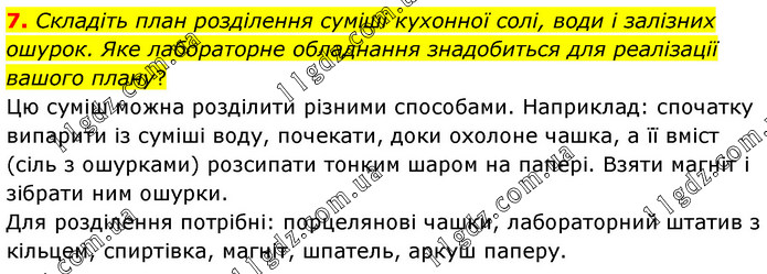 Складіть план розділення суміші кухонної солі, води і залізних ошурок. Яке лабораторне обладнання знадобиться для реалізації вашого плану? Цю суміш можна розділити різними способами. Наприклад: спочатку випарити із суміші воду, почекати, доки охолоне чашка, а її вміст (сіль з ошурками) розсипати тонким шаром на папері. Взяти магніт і зібрати ним ошурки. Для розділення потрібні: порцелянові чашки, лабораторний штатив з кільцем, спиртівка, магніт, шпатель, аркуш паперу.