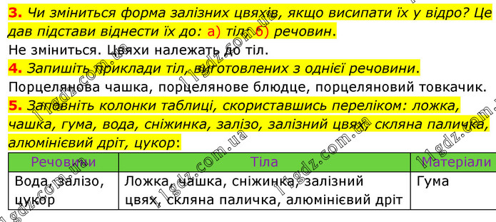 3. Чи зміниться форма залізних цвяхів, якщо висипати їх у відро? Це дав підстави віднести їх до: а) тіл; б) речовин. Не зміниться. Цвяхи належать до тіл. 4. Запишіть приклади тіл, виготовлених з однієї речовини. Порцелянова чашка, порцелянове блюдце, порцеляновий товкачик. 5. Заповніть колонки таблиці, скориставшись переліком: ложка, чашка, гума, вода, сніжинка, залізо, залізний цвях, скляна паличка, алюмінієвий дріт, цукор: