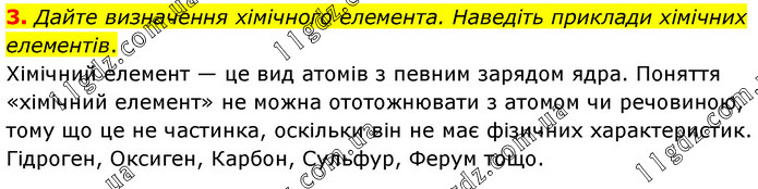 3. Дайте визначення хімічного елемента. Наведіть приклади хімічних елементів. Хімічний елемент — це вид атомів з певним зарядом ядра. Поняття «хімічний елемент» не можна ототожнювати з атомом чи речовиною, тому що це не частинка, оскільки він не має фізичних характеристик. Гідроген, Оксиген, Карбон, Сульфур, Ферум тощо.