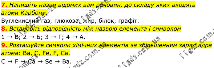 Напишіть назви відомих вам речовин, до складу яких входять атоми Карбону. Вуглекислий газ, глюкоза, жир, білок, графіт. 8. Встановіть відповідність між назвою елемента і символом 1 ➝ В; 2 ➝ Б; 3 ➝ Г; 4 ➝ А. 9. Розташуйте символи хімічних елементів за збільшенням заряд ядра атома: Ва, С, Fе, F, Са. С ➝ F ➝ Са ➝ Sе ➝ Ва.
