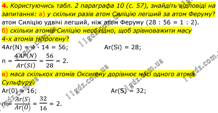 Користуючись табл. 2 параграфа 10 (с. 57), знайдіть відповіді на запитання: а) у скільки разів атом Силіцію легший за атом Феруму? атом Силіцію удвічі легший, ніж атом Феруму (28 : 56 = 1 : 2). б) скільки атомів Силіцію необхідно, щоб зрівноважити масу 4-х атомів Нітрогену? 4Аr(N) = 4 ∙ 14 = 56; Аr(Si) = 28; n = 4Ar(N)/Ar(Si) = 56/28 = 2. в) маса скількох атомів Оксигену дорівнює масі одного атома Сульфуру. Аr(0) = 16; Аr(S) = 32; n = Ar(S)/Ar(O) = 32/16 = 2.
