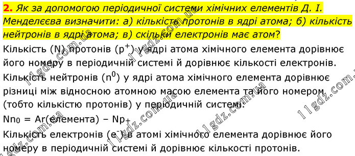 Як за допомогою періодичної системи хімічних елементів Д. І. Менделєєва визначити: а) кількість протонів в ядрі атома; б) кількість нейтронів в ядрі атома; в) скільки електронів має атом? Кількість (N) протонів (р+) у ядрі атома хімічного елемента дорівнює його номеру в періодичній системі й дорівнює кількості електронів. Кількість нейтронів (n0) у ядрі атома хімічного елемента дорівнює різниці між відносною атомною масою елемента та його номером (тобто кількістю протонів) у періодичній системі: Nn0 = Аr(елемента) – Np+ Кількість електронів (е-) в атомі хімічного елемента дорівнює його номеру в періодичній системі й дорівнює кількості протонів.