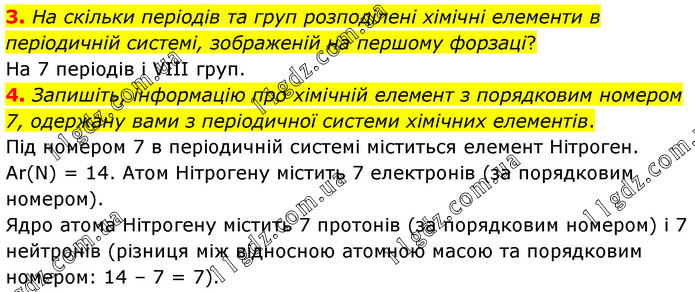 На скільки періодів та груп розподілені хімічні елементи в періодичній системі, зображеній на першому форзаці? На 7 періодів і VIII груп. 4. Запишіть, інформацію про хімічній елемент з порядковим номером 7, одержану вами з періодичної системи хімічних елементів. Під номером 7 в періодичній системі міститься елемент Нітроген. Аr(N) = 14. Атом Нітрогену містить 7 електронів (за порядковим номером). Ядро атома Нітрогену містить 7 протонів (за порядковим номером) і 7 нейтронів (різниця між відносною атомною масою та порядковим номером: 14 – 7 = 7).