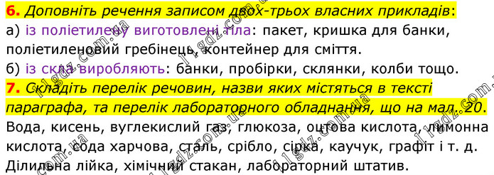 Доповніть речення записом двох-трьох власних прикладів: а) із поліетилену виготовлені тіла: пакет, кришка для банки, поліетиленовий гребінець, контейнер для сміття. б) із скла виробляють: банки, пробірки, склянки, колби тощо. 7. Складіть перелік речовин, назви яких містяться в тексті параграфа, та перелік лабораторного обладнання, що на мал. 20. Вода, кисень, вуглекислий газ, глюкоза, оцтова кислота, лимонна кислота, сода харчова, сталь, срібло, сірка, каучук, графіт і т. д. Ділильна лійка, хімічний стакан, лабораторний штатив.