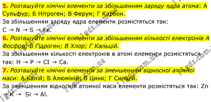 Розташуйте хімічні елементи за збільшенням заряду ядра атома: А Сульфур; Б Нітроген; В Ферум; Г Карбон. За збільшенням заряду ядра елементи розмістяться так: С ➝ N ➝ S ➝ Fе. 6. Розташуйте хімічні елементи за збільшенням кількості електронів А Фосфор; Б Гідроген; В Хлор; Г Кальцій. За збільшенням кількості електронів в атомі елементи розмістяться так: Н ➝ Р ➝ СІ ➝ Са. 7. Розташуйте хімічні елементи за зменшенням відносної атомної маси: А Калій; Б Алюміній; В Цинк; Г Силіцій. За зменшенням відносної атомної маси елементи розмістяться так: Zn ➝ К ➝ Sі ➝ Аl.