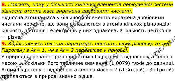 Поясніть, чому у більшості хімічних елементів періодичної системи відносна атомна маса виражена дробовими числами. Відносна атомна маса у більшості елементів виражена дробовими числами через те, що вони складаються з атомів кількох різновидів: кількість протонів і електронів у них однакова, а кількість нейтронів — різна. 9. Користуючись текстом параграфа, поясніть, який різновид атомів Гідрогену з Аг= 1, чи з Аг= 2 переважає у природі. У природі переважає різновид атомів Гідрогену з відносною атомною масою 1, оскільки його табличне значення (1,0079) тяжіє до одиниці. Атоми Гідрогену з відносною атомною масою 2 (Дейтерій) і 3 (Тритій) трапляються в природі значно рідше.