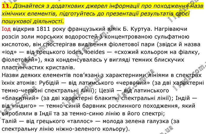 Дізнайтеся з додаткових джерел інформації про походження назв хімічних елементів, підготуйтесь до презентації результатів своєї пошукової діяльності. Іод відкрив 1811 року французький хімік Б. Куртуа. Нагріваючи розсіл золи морських водоростей з концентрованою сульфатною кислотою, він спостерігав виділення фіолетової пари (звідси й назва «іод» — від грецького iodes, ioeides — «схожий кольором на фіалку, фіолетовий»), яка конденсувалась у вигляді темних блискучих пластинчастих кристалів. Назви деяких елементів пов’язані з характерними лініями в спектрах їхніх атомів: Рубідій — від латинського «червоний» (за дві характерні темно-червоні спектральні лінії); Цезій — від латинського «блакитний» (за дві характерні блакитні спектральні лінії); Індій — від «індиго» — темно-синій барвник рослинного походження, який виробляли в Індії та за темно-синю лінію в його спектрі; Талій — від грецького «таллос» — молода зелена галузка (за спектральну лінію ніжно-зеленого кольору).