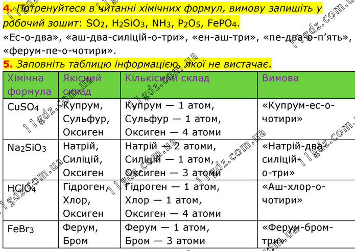 Потренуйтеся в читанні хімічних формул, вимову запишіть у робочий зошит: SO2, H2SiO3, NH3, P2O5, FePO4. «Ес-о-два», «аш-два-силіцій-о-три», «ен-аш-три», «пе-два-о-п’ять», «ферум-пе-о-чотири». 5. Заповніть таблицю інформацією, якої не вистачає.