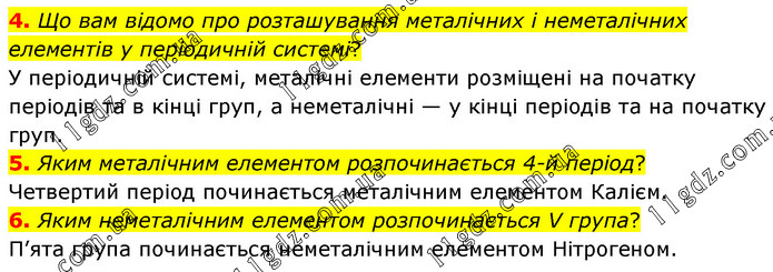 4. Що вам відомо про розташування металічних і неметалічних елементів у періодичній системі? У періодичній системі, металічні елементи розміщені на початку періодів та в кінці груп, а неметалічні — у кінці періодів та на початку груп. 5. Яким металічним елементом розпочинається 4-й період? Четвертий період починається металічним елементом Калієм. 6. Яким неметалічним елементом розпочинається V група? П’ята група починається неметалічним елементом Нітрогеном.