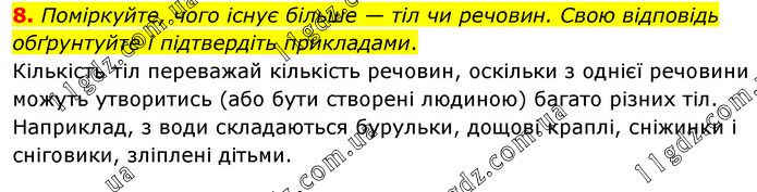 Поміркуйте, чого існує більше — тіл чи речовин. Свою відповідь обґрунтуйте і підтвердіть прикладами. Кількість тіл переважай кількість речовин, оскільки з однієї речовини можуть утворитись (або бути створені людиною) багато різних тіл. Наприклад, з води складаються бурульки, дощові краплі, сніжинки і сніговики, зліплені дітьми.
