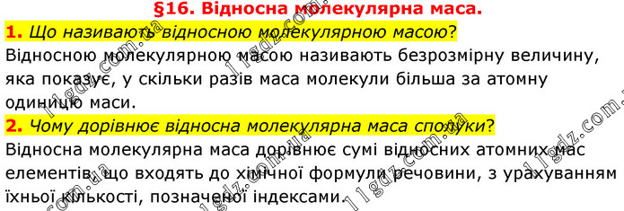 §16. Відносна молекулярна маса. 1. Що називають відносною молекулярною масою? Відносною молекулярною масою називають безрозмірну величину, яка показує, у скільки разів маса молекули більша за атомну одиницю маси. 2. Чому дорівнює відносна молекулярна маса сполуки? Відносна молекулярна маса дорівнює сумі відносних атомних мас елементів, що входять до хімічної формули речовини, з урахуванням їхньої кількості, позначеної індексами.