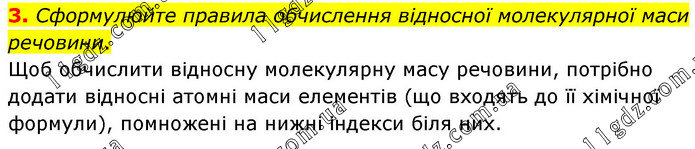 3. Сформулюйте правила обчислення відносної молекулярної маси речовини. Щоб обчислити відносну молекулярну масу речовини, потрібно додати відносні атомні маси елементів (що входять до її хімічної формули), помножені на нижні індекси біля них.