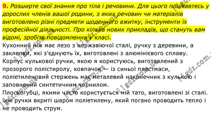 Розширте свої знання про тіла і речовини. Для цього поцікавтесь у дорослих членів вашої родини, з яких речовин чи матеріалів виготовлено різні предмети щоденного вжитку, інструменти їх професійної діяльності. Про кілька нових прикладів, що стануть вам відомі, зробіть повідомлення у класі. Кухонний ніж має лезо з нержавіючої сталі, ручку з деревини, а заклепки, які з’єднують їх, виготовлені з алюмінієвого сплаву. Корпус кулькової ручки, якою я користуюсь, виготовлений з прозорого полістиролу, ковпачок — із синьої пластмаси, поліетиленовий стержень має металевий наконечник з кулькою і заповнений синтетичним чорнилом. Плоскогубці, якими часто користується мій тато, виготовлені зі сталі. їхні ручки вкриті шаром поліетилену, який погано проводить тепло і не проводить струм.