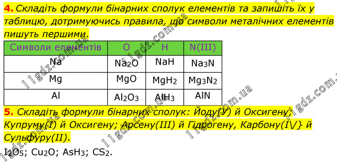 Складіть формули бінарних сполук елементів та запишіть їх у таблицю, дотримуючись правила, що символи металічних елементів пишуть першими. 5. Складіть формули бінарних сполук: Йоду(У) й Оксигену; Купруму(І) й Оксигену; Арсену(ІІІ) й Гідрогену, Карбону(І\/} й Сульфуру(ІІ). І2O5; Сu2O; АsН3; СS2.