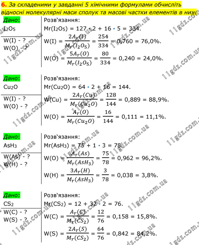 За складеними у завданні 5 хімічними формулами обчисліть відносні молекулярні маси сполук та масові частки елементів в них. Розв‘язання: Mr(I2O5) = 127 ∙ 2 + 16 ∙ 5 = 334. W(I) = (2A_r (I))/(M_r (I_2 O_5)) = 254/334 = 0,760 = 76,0%. W(O) = (5A_r (O))/(M_r (I_2 O_5)) = 80/334 = 0,240 = 24,0%. Розв‘язання: Mr(Cu2O) = 64 ∙ 2 + 16 = 144. W(Cu) = (2A_r (Cu))/(M_r (〖Cu〗_2 O)) = 128/144 = 0,889 = 88,9%. W(O) = (A_r (O))/(M_r (〖Cu〗_2 O)) = 16/144 = 0,111 = 11,1%. Розв‘язання: Mr(AsH3) = 75 + 1 ∙ 3 = 78. W(O) = (A_r (As))/(M_r (〖AsH〗_3)) = 75/78 = 0,962 = 96,2%. W(H) = (〖3A〗_r (H))/(M_r (〖AsH〗_3)) = 3/78 = 0,038 = 3,8%. Розв‘язання: Mr(CS2) = 12 + 32 ∙ 2 = 76. W(C) = (A_r (C))/(M_r (〖CS〗_2)) = 12/76 = 0,158 = 15,8%. W(S) = (〖2A〗_r (S))/(M_r (〖CS〗_2)) = 64/76 = 0,842 = 84,2%.