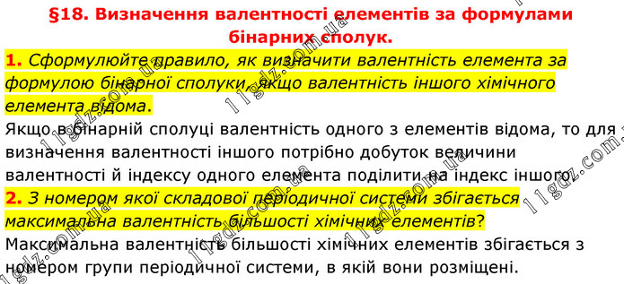 §18. Визначення валентності елементів за формулами бінарних сполук. 1. Сформулюйте правило, як визначити валентність елемента за формулою бінарної сполуки, якщо валентність іншого хімічного елемента відома. Якщо в бінарній сполуці валентність одного з елементів відома, то для визначення валентності іншого потрібно добуток величини валентності й індексу одного елемента поділити на індекс іншого. 2. З номером якої складової періодичної системи збігається максимальна валентність більшості хімічних елементів? Максимальна валентність більшості хімічних елементів збігається з номером групи періодичної системи, в якій вони розміщені.
