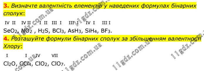 Визначте валентність елементів у наведених формулах бінарних сполук: IV II IV II I II III I III I IV I III I SeO2, NO2 , H2S, BCl3, AsH3, SiH4, BF3. 4. Розташуйте формули бінарних сполук за збільшенням валентності Хлору: I I IV VII Cl2O, CCl4, ClO2, ClO7.