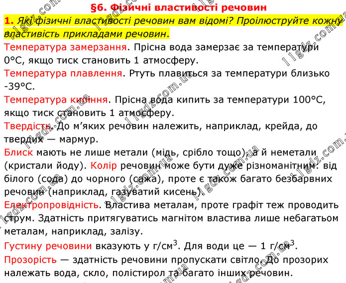 §6. Фізичні властивості речовин 1. Які фізичні властивості речовин вам відомі? Проілюструйте кожну властивість прикладами речовин. Температура замерзання. Прісна вода замерзає за температури 0°С, якщо тиск становить 1 атмосферу. Температура плавлення. Ртуть плавиться за температури близько -39°С. Температура кипіння. Прісна вода кипить за температури 100°С, якщо тиск становить 1 атмосферу. Твердість. До м’яких речовин належить, наприклад, крейда, до твердих — мармур. Блиск мають не лише метали (мідь, срібло тощо), а й неметали (кристали йоду). Колір речовин може бути дуже різноманітним: від білого (сода) до чорного (сажа), проте є також багато безбарвних речовин (наприклад, газуватий кисень). Електропровідність. Властива металам, проте графіт теж проводить струм. Здатність притягуватись магнітом властива лише небагатьом металам, наприклад, залізу. Густину речовини вказують у г/см3. Для води це — 1 г/см3. Прозорість — здатність речовини пропускати світло. До прозорих належать вода, скло, полістирол та багато інших речовин.