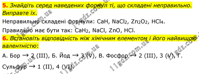 Знайдіть серед наведених формул ті, що складені неправильно. Виправте їх. Неправильно складені формули: СаН, NaCl2, Zn2O2, НСl4. Правильно має бути так: СаН2, NaCl, ZnO, НСl. 6. Встановіть відповідність між хімічним елементом і його найвищою валентністю: А. Бор → 2 (ІІІ), Б. Йод → 3 (V), В. Фосфор → 2 (ІІІ), 3 (V), Г. Сульфур → 1 (ІІ), 4 (VІ).