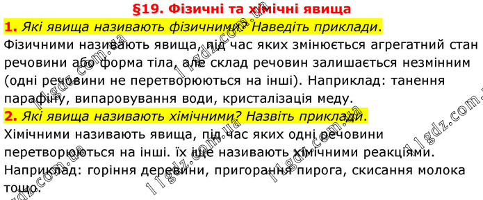 §19. Фізичні та хімічні явища 1. Які явища називають фізичними? Наведіть приклади. Фізичними називають явища, під час яких змінюється агрегатний стан речовини або форма тіла, але склад речовин залишається незмінним (одні речовини не перетворюються на інші). Наприклад: танення парафіну, випаровування води, кристалізація меду. 2. Які явища називають хімічними? Назвіть приклади. Хімічними називають явища, під час яких одні речовини перетворюються на інші. їх іще називають хімічними реакціями. Наприклад: горіння деревини, пригорання пирога, скисання молока тощо.