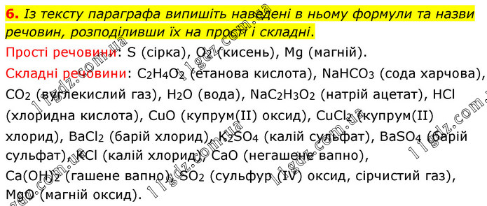 Із тексту параграфа випишіть наведені в ньому формули та назви речовин, розподіливши їх на прості і складні. Прості речовини: S (сірка), О2 (кисень), Mg (магній). Складні речовини: С2Н4О2 (етанова кислота), NaHCO3 (сода харчова), СO2 (вуглекислий газ), Н2O (вода), NaC2H3O2 (натрій ацетат), НСl (хлоридна кислота), СuО (купрум(ІІ) оксид), СuСl2 (купрум(II) хлорид), ВаСl2 (барій хлорид), K2SO4 (калій сульфат), BaSO4 (барій сульфат), КСl (калій хлорид), СаО (негашене вапно), Са(ОН)2 (гашене вапно), SO2 (сульфур (IV) оксид, сірчистий газ), MgO (магній оксид).