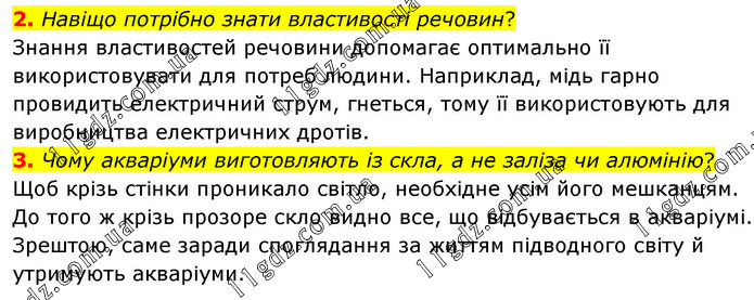 Навіщо потрібно знати властивості речовин? Знання властивостей речовини допомагає оптимально її використовувати для потреб людини. Наприклад, мідь гарно провидить електричний струм, гнеться, тому її використовують для виробництва електричних дротів. 3. Чому акваріуми виготовляють із скла, а не заліза чи алюмінію? Щоб крізь стінки проникало світло, необхідне усім його мешканцям. До того ж крізь прозоре скло видно все, що відбувається в акваріумі. Зрештою, саме заради споглядання за життям підводного світу й утримують акваріуми.