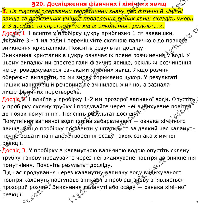 §20. Дослідження фізичних і хімічних явищ 1. На підставі одержаних теоретичних знань про фізичні й хімічні явища та практичних умінь з проведення різних явищ складіть умови 2-3 дослідів та спрогнозуйте хід їх виконання і результати. Дослід 1. Насипте у пробірку цукру приблизно 1 см заввишки, додайте 3 - 4 мл води і перемішуйте скляною паличкою до повного зникнення кристаликів. Поясніть результат досліду. Зникнення кристаликів цукру означає їх повне розчинення у воді. У цьому випадку ми спостерігали фізичне явище, оскільки розчинення не супроводжувалося ознаками хімічних явищ. Якщо розчин обережно випарити, то ми знову отримаємо цукор. У результаті наших маніпуляцій речовина не змінилась хімічно, а зазнала лише фізичних перетворень. Дослід 2. Налийте у пробірку 1-2 мм прозорої вапняної води. Опустіть у пробірку скляну трубку і продувайте через неї видихуване повітря до появи помутніння. Поясніть результат досліду. Помутніння вапняної води (зміна забарвлення) — ознака хімічного явища. Якщо пробірку поставити у штатив, то за деякий час каламуть почне осідати на її дно. Утворення осаду також ознака хімічної реакції. Дослід 3. У пробірку з каламутною вапняною водою опустіть скляну трубку і знову продувайте через неї видихуване повітря до зникнення помутніння. Поясніть результат досліду. Під час продування через каламутну вапняну воду видихуваного повітря каламуть поступово зникає і в пробірці знову з 'являється прозорий розчин. Зникнення каламуті або осаду — ознака хімічної реакції.