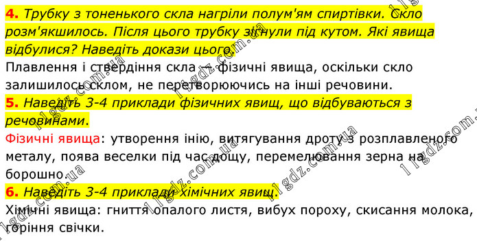 Трубку з тоненького скла нагріли полум'ям спиртівки. Скло розм'якшилось. Після цього трубку зігнули під кутом. Які явища відбулися? Наведіть докази цього. Плавлення і ствердіння скла — фізичні явища, оскільки скло залишилось склом, не перетворюючись на інші речовини. 5. Наведіть 3-4 приклади фізичних явищ, що відбуваються з речовинами. Фізичні явища: утворення інію, витягування дроту з розплавленого металу, поява веселки під час дощу, перемелювання зерна на борошно. 6. Наведіть 3-4 приклади хімічних явищ. Хімічні явища: гниття опалого листя, вибух пороху, скисання молока, горіння свічки.